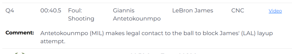 最后40.5秒,字母哥对詹姆斯的上篮尝试进行了合法封盖。(注:报告上没有提到打到詹姆斯手的特纳)