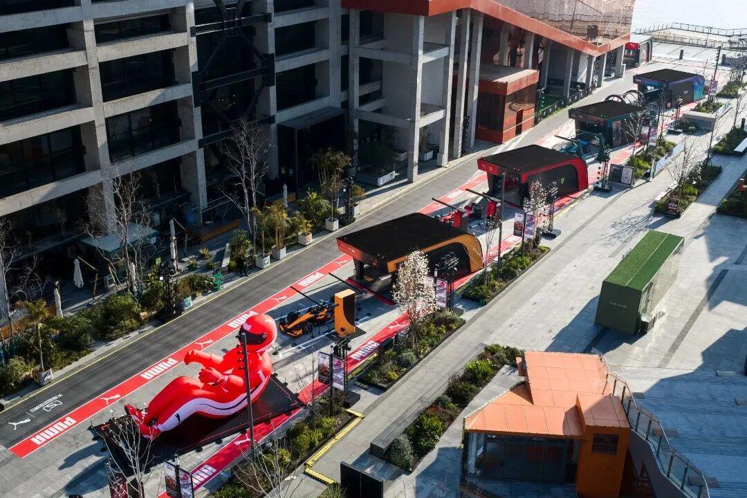 作为F1官方赞助商,PUMA在南京路带来了「轰鸣之外」赛车主题快闪,同时,在西岸梦中心落地了以赛车「P房」为核心概念的沉浸式空间,直接把法拉利、迈凯伦、阿斯顿马丁三台赛车从各个车队总部运到了上海 。