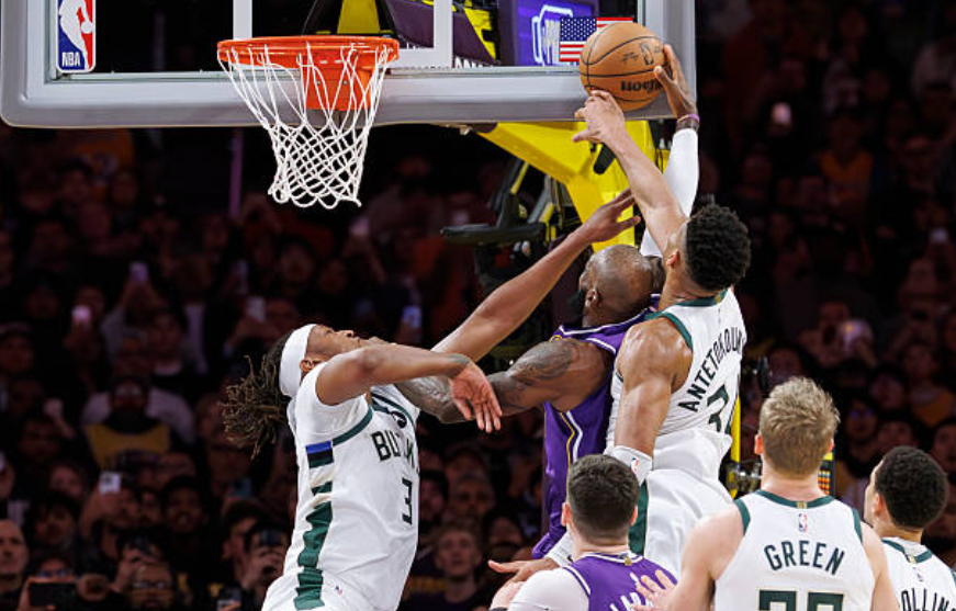 在昨天的NBA常规赛,湖人101-105不敌雄鹿,最后30秒,詹姆斯在一次突破中被字母哥盖帽。不过从照片上来看,旁边防守的特纳已经明显犯规。不过,已经出炉的NBA最后两分钟裁判报告对这一球解释为没有犯规。